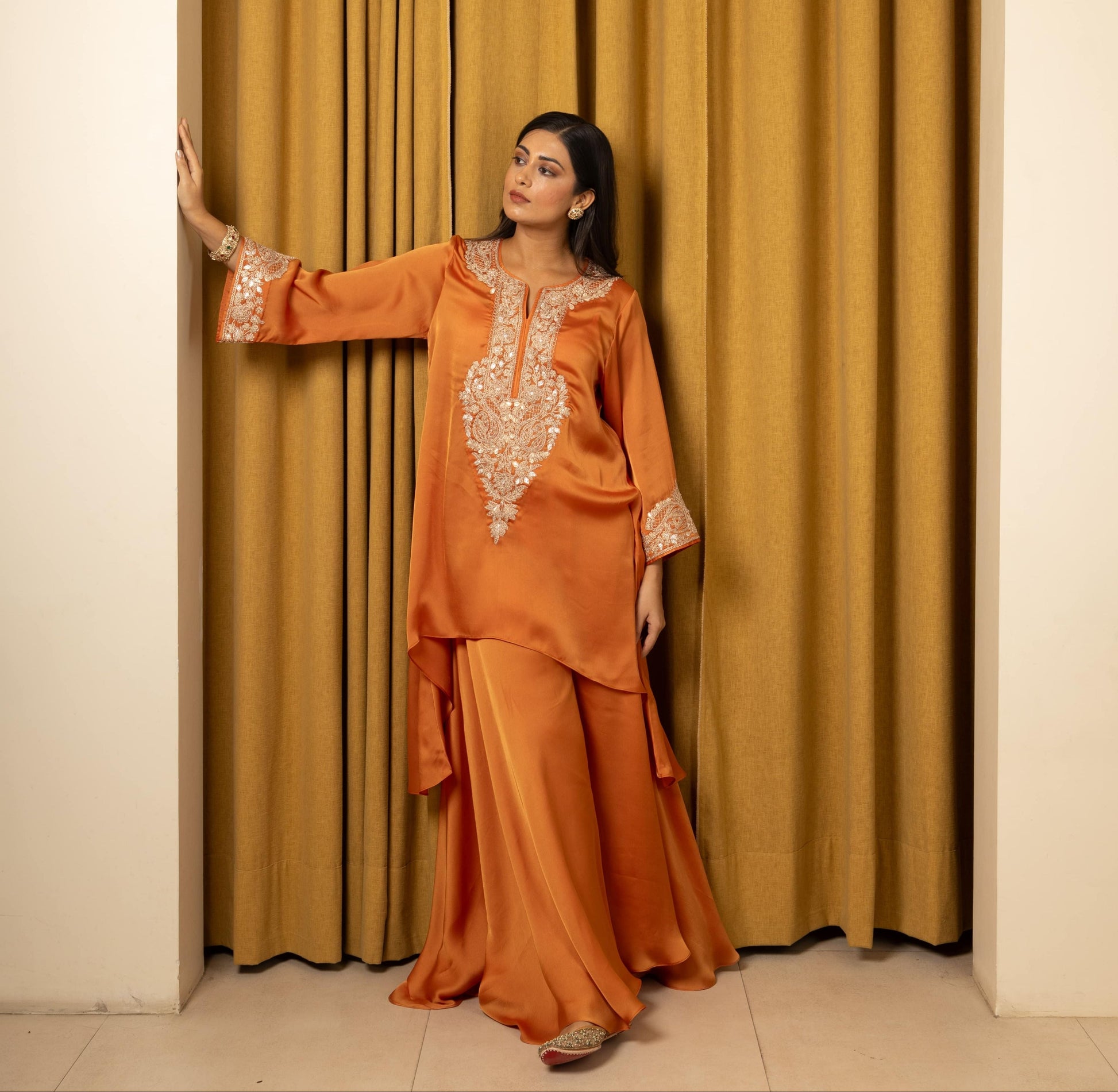 Rust satin kurta with Dori and gotta embroidery, paired with a symmetrical Sharara. Customizable in any color.