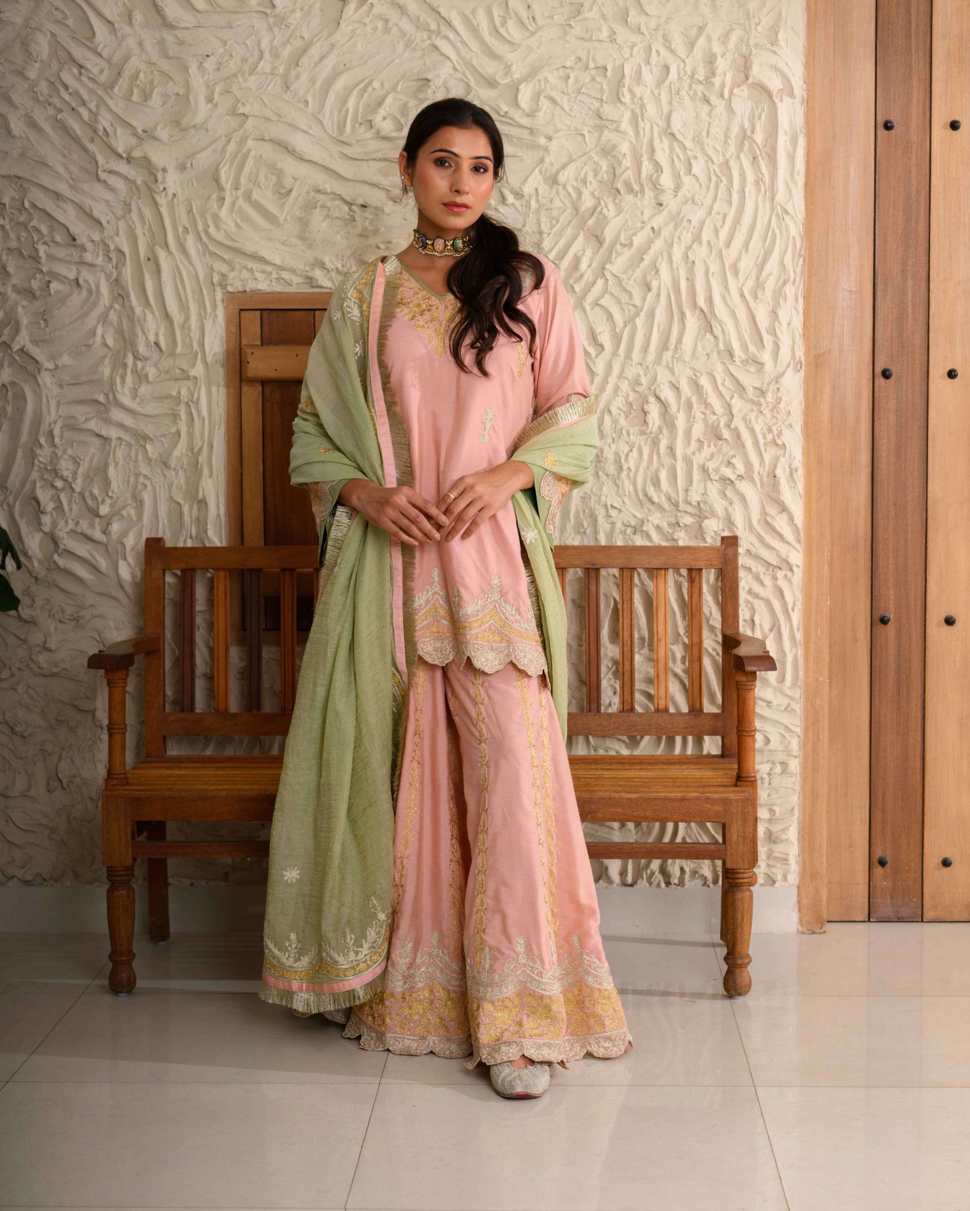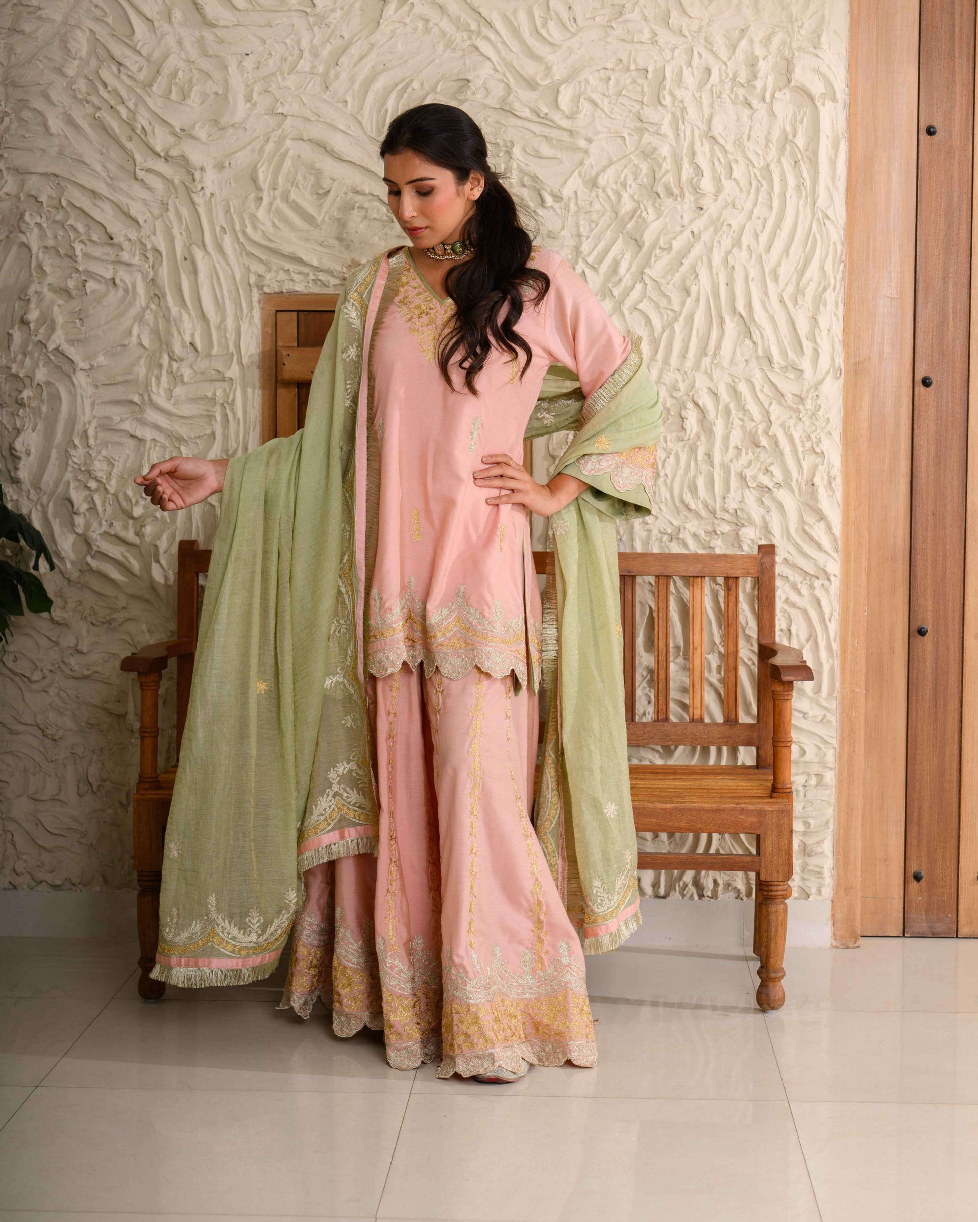 Aari Zari Embroidered Sharara Set – Double-toned sharara adorned with intricate aari and zari embroidery, paired with a contrasting pure chanderi tissue dupatta.