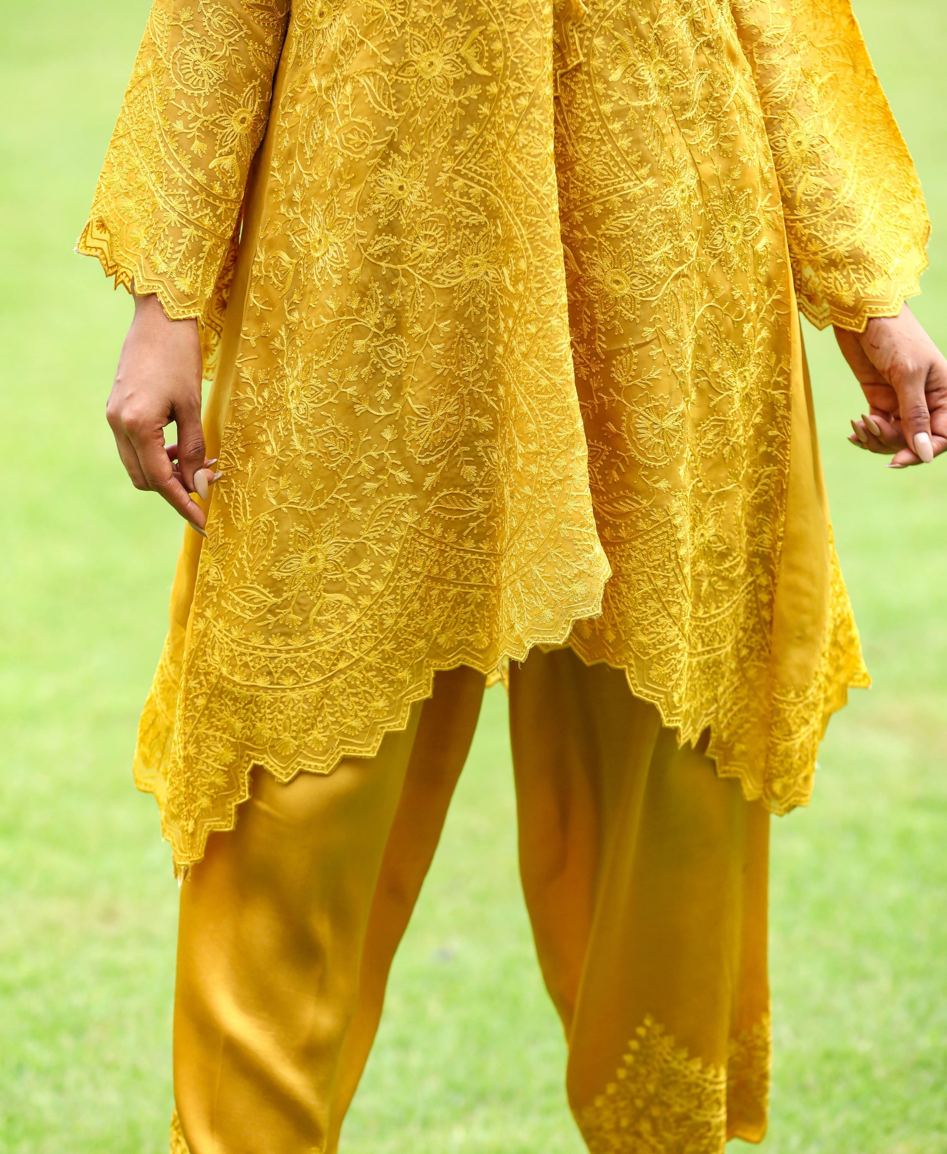 Single thread-aari embroidered organza jacket paired with embroidered pakistani salwar.