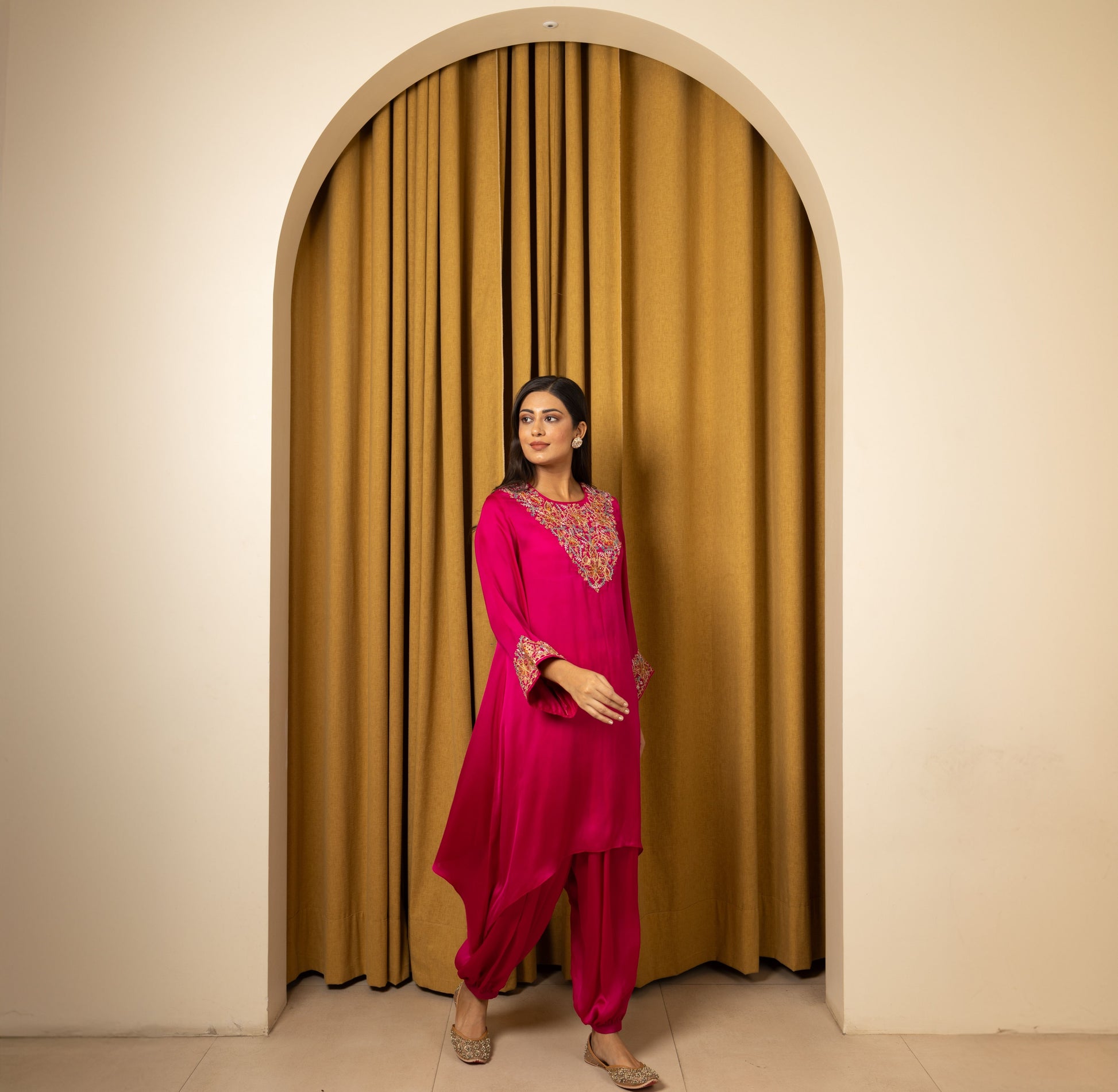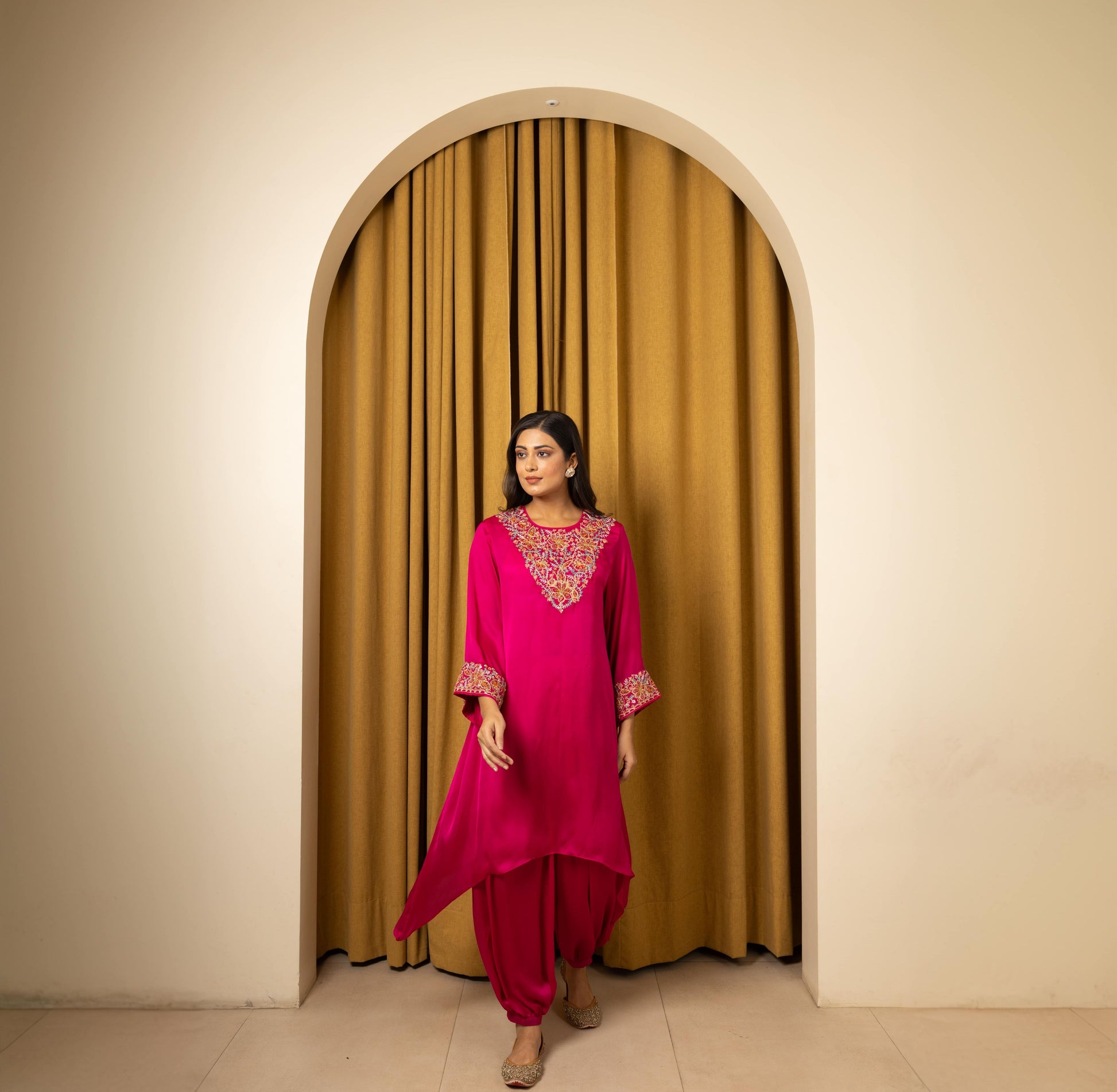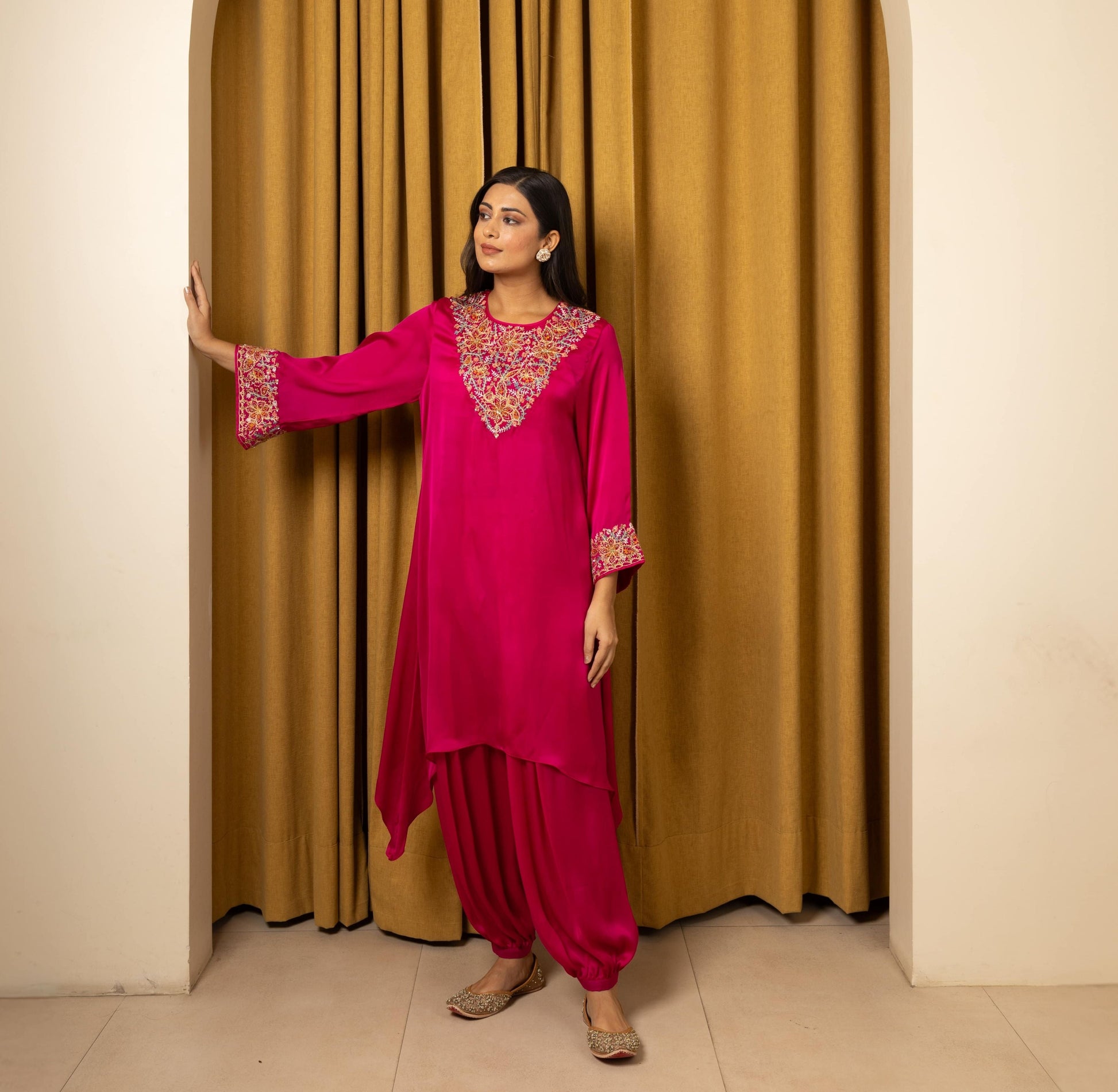 Single-thread and sequin-embroidered kurta with a Pakistani salwar in satin, available in fuchsia and mustard yellow. Customizable in any color.