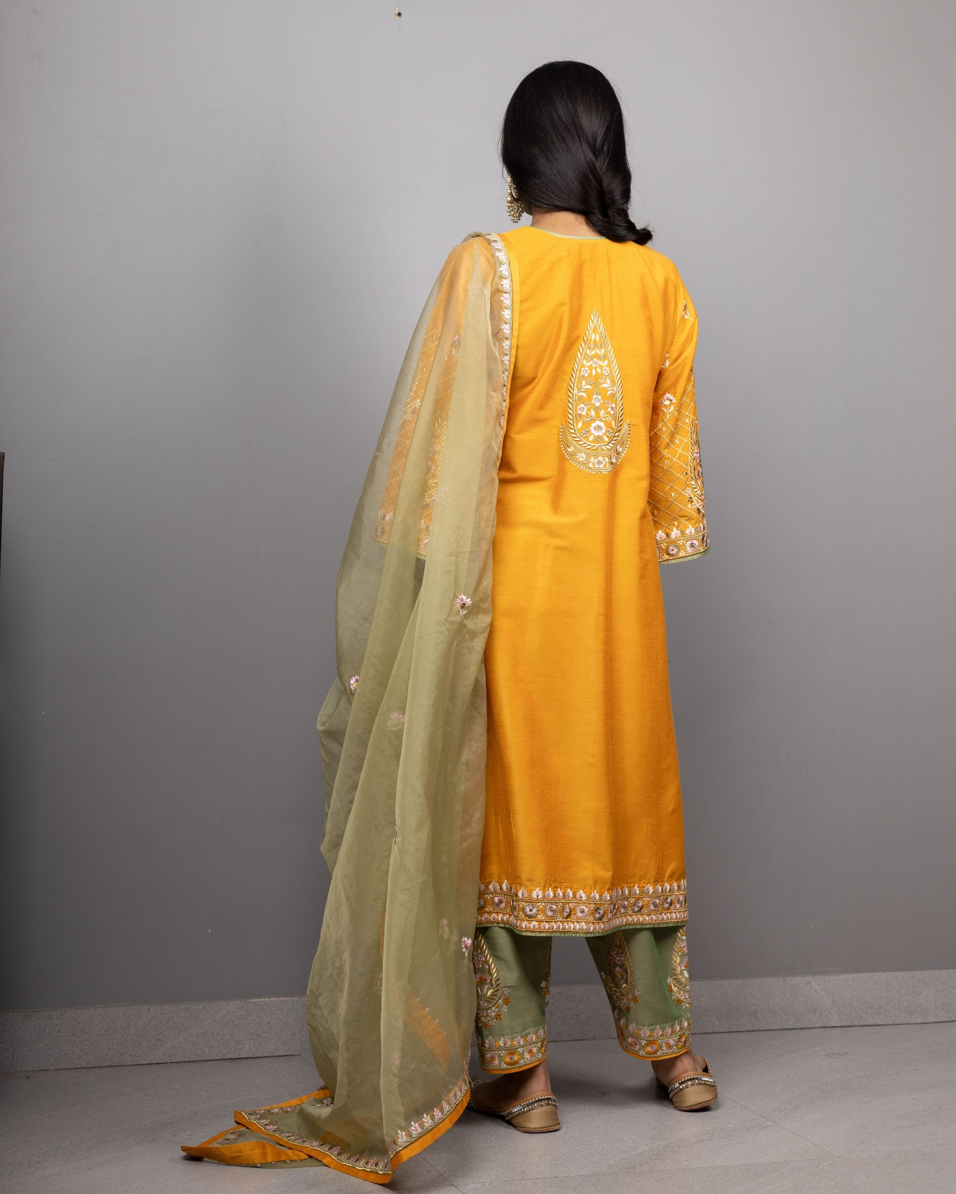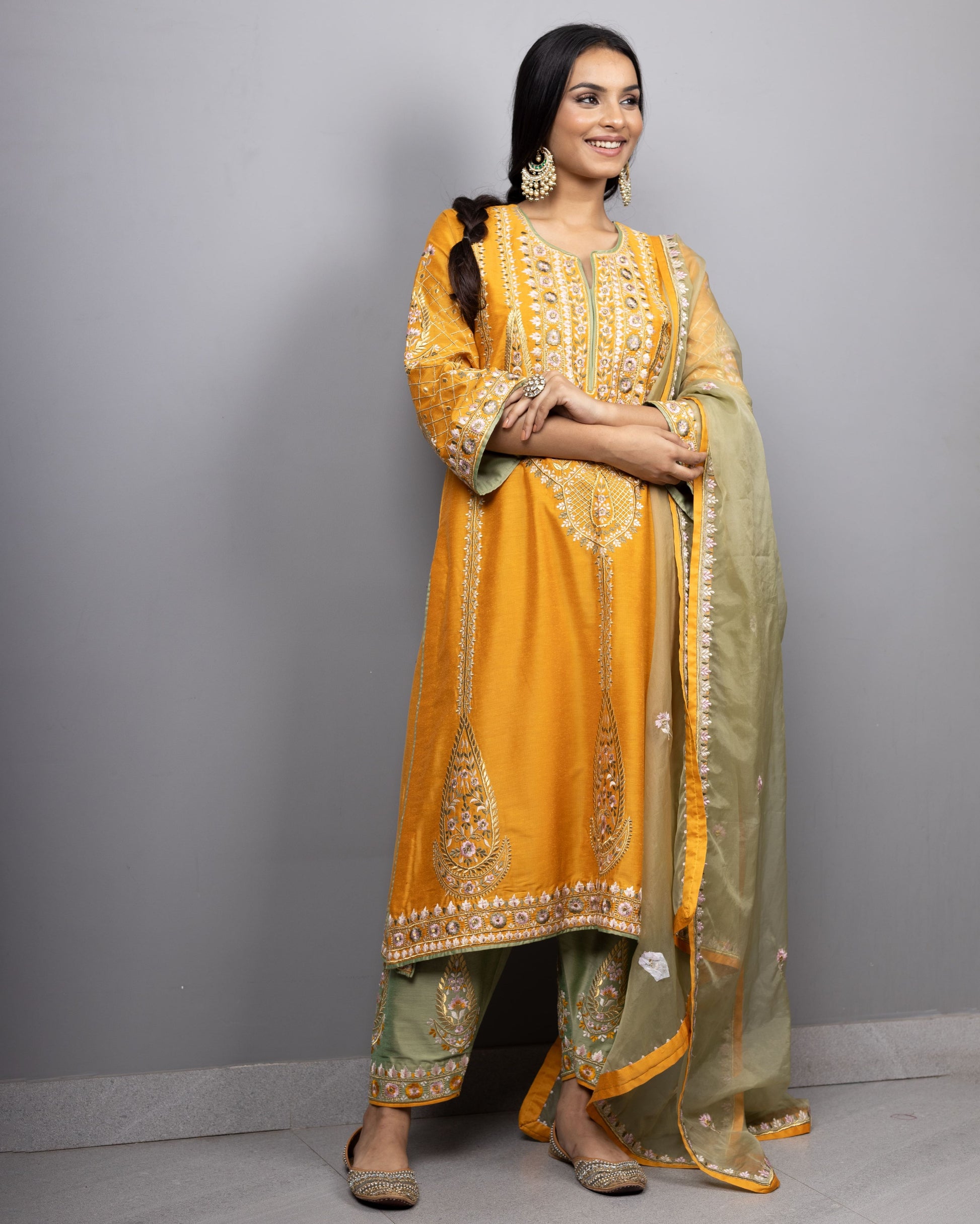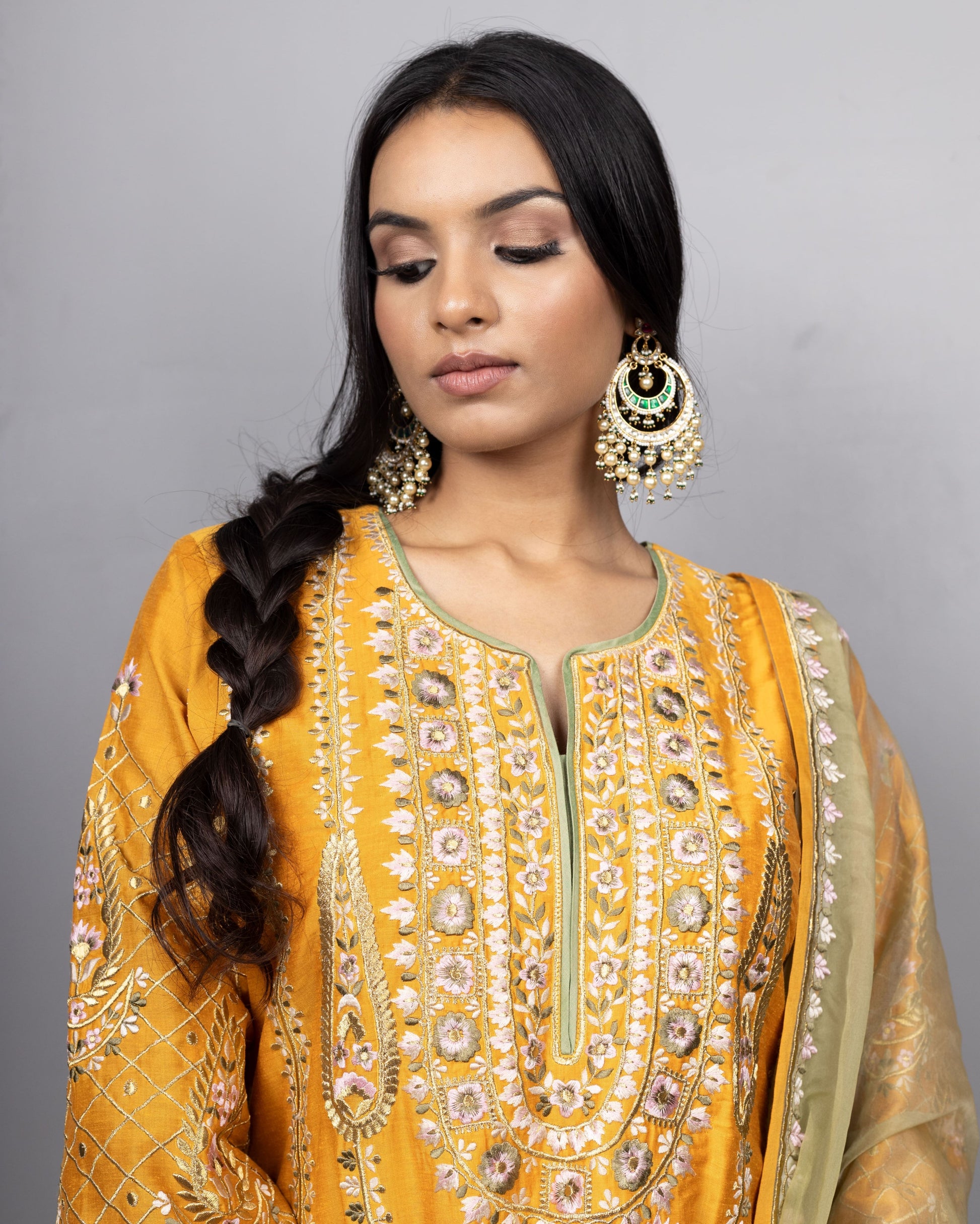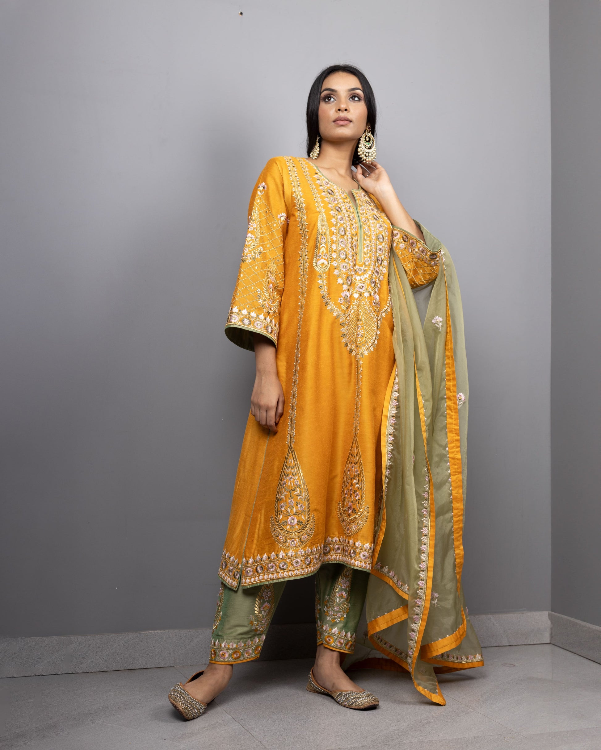 Very finely embroidered with thread and zari paired with a contrast embroidered pakistani salwar and embroidered organza dupatta. Can be customised in more colours.
